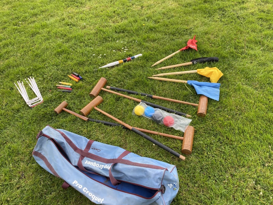 • Complete croquet set with mallets, balls, hoops, and pegs